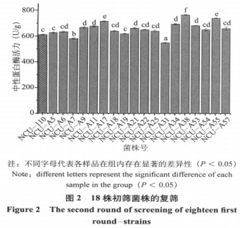 點(diǎn)種取決于調(diào)查優(yōu)質(zhì)菌種是不是能在集中的培育中仍能保持較高的中性蛋白酶魅力,而且規(guī)定菌種的發(fā)育速度快,對(duì)自然環(huán)境適應(yīng)能力強(qiáng)。菌種正基因突變主要表現(xiàn)為菌體漲勢(shì)好而且K值比對(duì)比值大。由表1得知,18株初篩菌種的K值均超過(guò)初始菌種,其產(chǎn)中性蛋白酶工作能力很有可能好于初始菌種,在其中菌種NCU—A38、NCU—A55、NCU—A17菌體漲勢(shì)不錯(cuò),且全透明圈直徑較大 ,各自為25.6、23.5、23.5mm,而他們的K值則各自實(shí)現(xiàn)了2.08、2.04、1.77。袁艷玲研究表明,根據(jù)K值挑選正基因突變株高效率,但菌種的產(chǎn)中性蛋白酶工作能力與K值并并不是呈規(guī)律性的線(xiàn)性相關(guān)。因此必須 進(jìn)一步的復(fù)篩來(lái)明確最后增產(chǎn)中性蛋白酶活的基因突變株,試驗(yàn)選用淺盤(pán)酒曲制作測(cè)量中性蛋白酶活給予認(rèn)證。