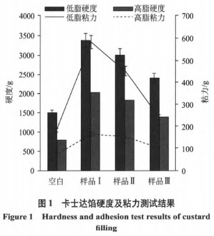 由圖1得知,高脂肪試品強(qiáng)度比低脂肪試品強(qiáng)度小,而加入了WPC80和SPI的強(qiáng)度最大,粘結(jié)力也是最大,表明WPC80和SPI的乳狀液特性更強(qiáng),空缺組的強(qiáng)度及其粘結(jié)力均較小。