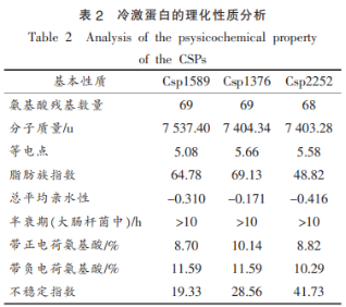 運(yùn)用ProtParam預(yù)測(cè)分析腐壞希瓦氏菌冷激蛋白質(zhì)的基本上生理學(xué)、生物化學(xué)特點(diǎn),結(jié)果見表2。預(yù)測(cè)分析的腐壞希瓦氏菌冷激蛋白質(zhì)是由68~69個(gè)氨基酸殘基組成,分子質(zhì)量在7.4ku上下的小分子水蛋白質(zhì),且其帶負(fù)電的碳水化合物的量超過(guò)帶正電碳水化合物的量,即酸性氨基酸的量超過(guò)堿性氨基酸的量,PI低于7,表明這種蛋白全是酸堿性蛋白,合乎CSPs的特性。蛋白的總均值吸水性為負(fù)值,表明測(cè)量的蛋白質(zhì)皆為吸水性蛋白質(zhì)。由不穩(wěn)定指數(shù)得知,除Csp2252外,蛋白在離體的穩(wěn)定都不錯(cuò),在大腸埃希菌身體的藥物半衰期超過(guò)10h。PSORT預(yù)測(cè)分析腐壞希瓦氏菌冷激蛋白質(zhì)皆定坐落于細(xì)胞核。TMHMM預(yù)測(cè)分析數(shù)據(jù)顯示腐壞希瓦氏菌冷激蛋白質(zhì)均不會(huì)有α螺旋式跨膜,是是非非跨膜蛋白。SignalIP預(yù)測(cè)分析結(jié)果顯示腐壞希瓦氏菌冷激蛋白質(zhì)不會(huì)有信號(hào)肽,不可以代謝到胞外。推斷腐壞希瓦氏菌的3個(gè)冷激蛋白質(zhì)均為非代謝型、非跨膜蛋白,冷激蛋白質(zhì)在腐壞希瓦氏菌細(xì)胞核中生成后不開展蛋白質(zhì)裝運(yùn),只是保存在細(xì)胞基質(zhì)中充分發(fā)揮。