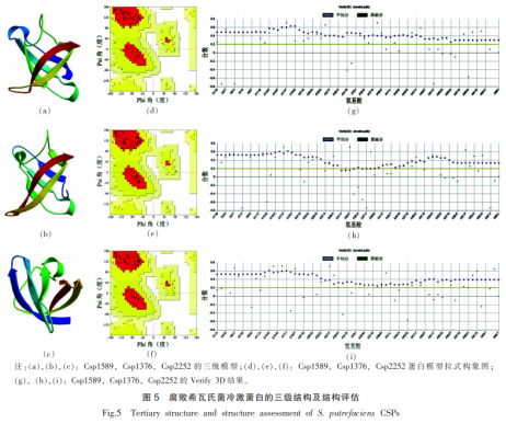 為更強(qiáng)掌握冷激蛋白質(zhì)潛在性的微生物作用,剖析其蛋白質(zhì)的空間布局。將海產(chǎn)品腐壞希瓦氏菌冷激蛋白質(zhì)的碳水化合物編碼序列遞交到PSIPRED預(yù)測(cè)分析其二級(jí)結(jié)構(gòu),結(jié)果見圖4。典型性的冷激蛋白質(zhì)的二級(jí)結(jié)構(gòu)包括五個(gè)β伸縮,預(yù)測(cè)分析獲得的二級(jí)結(jié)構(gòu)與這一結(jié)果大概相符合,Csp1589和Csp1376二級(jí)結(jié)構(gòu)的最后一個(gè)β伸縮發(fā)生斷塊,這可能是天冬酰胺預(yù)測(cè)分析真實(shí)度太低而致。