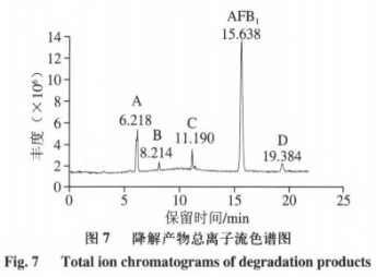 如圖所示7所顯示,AFB1經(jīng)漆酶溶解后檢驗(yàn)到4個(gè)新的色譜儀峰,由峰形和分離度可看得出,各物質(zhì)分離出來實(shí)際效果不錯(cuò),且由保存期不一樣推斷溶解物質(zhì)不一樣。依據(jù)AFB1和溶解物質(zhì)的保存期分辨5種化學(xué)物質(zhì)的旋光性尺寸為A>B>C>AFB1>D。