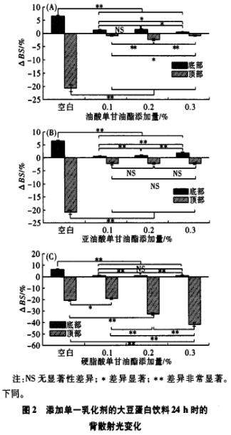 △BS意味著某一檢測(cè)時(shí)時(shí)刻刻的背漫射光與原始的背漫射光值之差,ABS的改變值越小,試品越平穩(wěn)。將每一個(gè)試品在檢測(cè)時(shí)長(zhǎng)為24h時(shí)的上方和底邊的背漫射光轉(zhuǎn)變 值△鄙與未加上破乳劑的空缺試品對(duì)比,剖析大豆蛋白粉飲品的可靠性。各自加上脂肪酸單甘油酯、脂肪酸單甘油酯及聚醚單甘油酯的大豆蛋白粉飲品在24h時(shí)的背漫射光轉(zhuǎn)變 如圖2所顯示。
