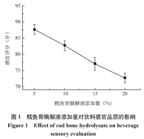 銀鱈魚骨酶解液加上量對飲品質(zhì)量的危害結(jié)果如圖所示1。伴隨著銀鱈魚骨酶解液加上量提升,感觀得分展現(xiàn)減少的發(fā)展趨勢。導(dǎo)致這個情況的因素有可能是由于銀鱈魚骨酶解液加上量太多會造成 腥臭味加劇,危害飲品口味,造成 感觀得分降低。在其中銀鱈魚骨酶解液加上量5%,感觀得分最大為87.67分。