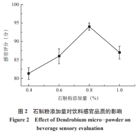石斛粉加上量對飲品質(zhì)量的危害結(jié)果如圖2。伴隨著石斛粉加上量提升,感觀得分先升高后降低。石斛粉加上量0.8%,感觀得分最大9四分。這也許因為石斛粉對飲品有提鮮功效,伴隨著石斛粉加上量的提升,逐漸發(fā)生變化了銀鱈魚骨酶解液的腥臭味和苦澀味,淡石斛粉加上量太多,造成 飲品材質(zhì)越來越過度粘稠,危害口味,進而造成 感觀得分降低。