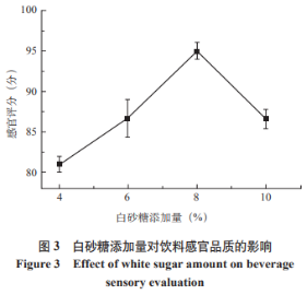 伴隨著白糖加上量提升,感觀得分先上升后減少。白糖加上量8%,感觀得分最大95分。這也許因為白糖對飲品有提鮮功效,伴隨著白糖加上量提升,飲品糖度提升,可是白糖加上量過高,造成 飲品過甜進而感觀得分降低。