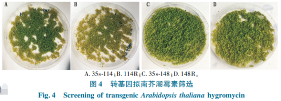 經(jīng)潮霉素挑選T0轉(zhuǎn)基因水稻擬南芥種籽后(圖4),對(duì)T1開展pCambia1300-35s-114、pCambia1300-RNAi-114、pCambia1300-35s-148及pCambia1300-RNAi-148媒介潮霉素評(píng)定,結(jié)果顯示(圖5),目地質(zhì)粒T-DNA均已插進(jìn)擬南芥基因,說(shuō)明擬南芥轉(zhuǎn)基因水稻取得成功。