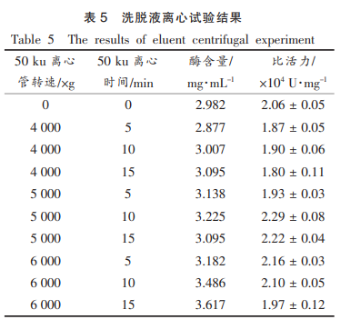 將以上提升標準制取酶液做進一步超濾膜純化提升,將酶液放置截流量為50ku的超濾離心管中,于4000~6000×g,離心式5~15min,去除雜蛋白質,棄去離心管架頂層液。再將下一層液放置截流量為3ku的超濾離心管中,于6500×g,離心式20min,保存頂層截流液,測量其酶成分及比魅力,結果如表5所顯示。得知,伴隨著轉數(shù)的上升,酶成分逐步上升,而溶菌酶比魅力呈先升高后降低的發(fā)展趨勢,推斷因為離心式轉速比過低促使溶菌酶被一部分截流在頂層,而離心式轉速比過高,雖能將溶菌酶所有通過下一層,但一部分雜蛋白質不可以有效的除去,一樣不被截流,或者溶菌酶在快速離心式歷程中有一定的損害,致酶魅力降低。且伴隨著離心式時間增加,比魅力有所增加,殊不知離心式時間不適合太長,太長的離心式時間會使工作效率減少,不利大規(guī)模生產。故當溶菌酶比魅力為最高值時,挑選50ku超濾離心管,在5000×g標準下離心式10min。