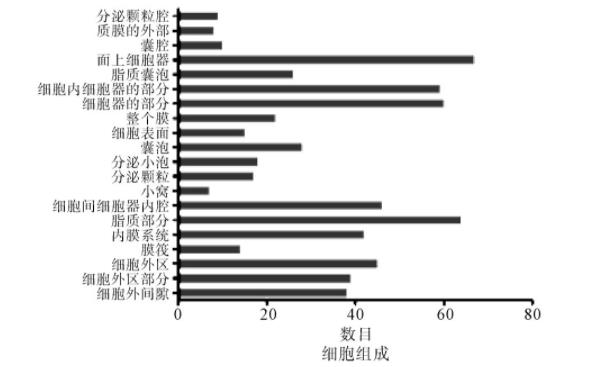 將所取得的81個靶標(biāo)導(dǎo)進(jìn)STRING數(shù)據(jù)庫查詢開展GO作用聚集剖析,獲得GO內(nèi)容1 892個,在其中微生物全過程內(nèi)容1 648個,細(xì)胞組成內(nèi)容82個,分子結(jié)構(gòu)作用內(nèi)容162個,各自占73%、13%、14%.在其中,微生物全過程關(guān)鍵涉及到碳?xì)浠衔镄玛惔x全過程的正管控、生物大分子新陳代謝全過程的正管控、體細(xì)胞全過程的正管控、刺激性反映的調(diào)整、體細(xì)胞對有機(jī)化學(xué)成分的反映、體細(xì)胞對有機(jī)化學(xué)刺激性的化學(xué)反應(yīng)及對含氧量化學(xué)物質(zhì)的反映等全過程;分子結(jié)構(gòu)作用關(guān)鍵涉及到激話轉(zhuǎn)錄因子融合、蛋白融合、酶融合及蛋白異構(gòu)化活力等作用;細(xì)胞組成涉及到在膜融合體細(xì)胞器、細(xì)胞核部、胞外區(qū)及細(xì)胞結(jié)構(gòu)等地區(qū).3個支系總數(shù)排名前20位有關(guān)內(nèi)容信息內(nèi)容柱形圖如圖所示2所顯示.
