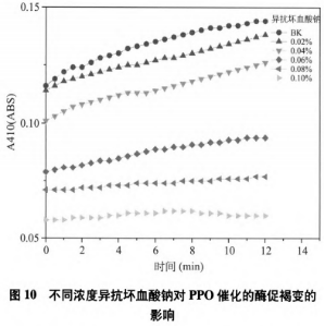 異抗壞血酸鈉氧化性極強(qiáng),能將醌類以及化合物轉(zhuǎn)變成酚類化合物,阻攔有色板塊成分的匯聚,是食物中一種主要的防腐劑。由圖10得知,伴隨著異抗壞血酸鈉濃度值的上升,管理體系褐變度縮小,當(dāng)異抗壞血酸鈉的含量為O.10%時(shí)褐變的控制實(shí)際效果最好是。伴隨著時(shí)間的增加,同一濃度值異抗壞血酸鈉抑止褐變的實(shí)際效果下降。
