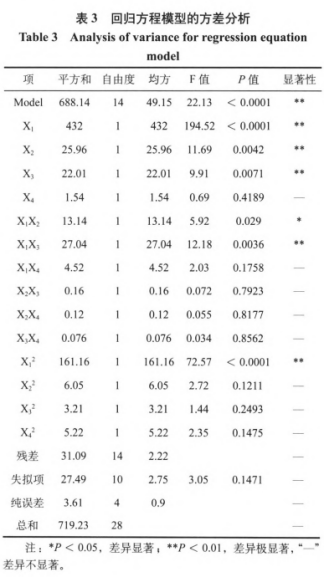 依據(jù)響應(yīng)面實(shí)驗(yàn)方案設(shè)計(jì)以及試驗(yàn)結(jié)果,必須 創(chuàng)建線(xiàn)性回歸方程實(shí)體模型,用以分辨各要素兩者之間的配對(duì)t檢驗(yàn)是不是明顯,為用以分析和剖析黑豆活性多肽抗氧化的轉(zhuǎn)變,因此還需分辨其偏差的尺寸。即試驗(yàn)擬合程度與在最好情況下抗氧化的一致水平。黑豆活性多肽抗氧化的線(xiàn)性回歸方程實(shí)體模型的方差分析如表3所顯示。