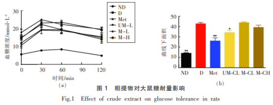 注入STZ成模后,歷經(jīng)歷時(shí)4周的高脂肪飼養(yǎng),D組與干涉組的血糖明顯高過(guò)ND組(圖1a),并發(fā)生了糖耐量受損(IGT),OGTT曲線圖下總面積(AUC)提升(圖1b),與ND組是極明顯差別(P<0.01)。二甲雙胍可明顯改進(jìn)由STZ協(xié)同高脂肪誘發(fā)的大白鼠IGT及血糖,AUC及血糖與D組比有明顯差別(P<0.05)。UM-CL可明顯提升大白鼠IGT及血糖,其作用與二甲雙胍非常,Met組與UM-CL組小白鼠AUC各自減少38.97%,19.95%。而熟小米手機(jī)粗提取液實(shí)際效果較弱,在低/濃度較高的下AUC及血糖均與D組無(wú)明顯差別。