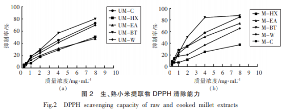 如圖所示2所顯示。各提取液對(duì)DPPH的清理實(shí)際效果與試品濃度值呈使用量相互依賴。各提取液的抗氧化能力存有很大差別,在試品濃度值為8mg/mL時(shí),生小米手機(jī)組UM-C、UM-HX、UM-EA、UM-BT、UM-W的DPPH消除工作能力各自為(73.26±0.22)%,(50.91±0.40)%,(48.14±0.74)%,(80.19±1.31)%及(69.91±0.85)%(圖2a);熟小米手機(jī)組M-C、M-HX、M-EA、M-BT、M-W的DPPH消除工作能力各自為(85.14±0.43)%,(37.57±0.73)%,(74.29±0.16)%,(87.61±0.32)%,(65.61±0.5)%(圖2b)。由圖2a和圖2b得知,各提取液的DPPH消除工作能力為MBT>M-C>UM-BT>M-EA>UM-C>UM-W>M-W>UM-HX>UM-EA>M-HX。由此可見,根據(jù)熟成解決后的M-C、M-BT的DPPH消除工作能力高過(guò)UM-C、UM-BT,表明熟成后小米手機(jī)很有可能具備更強(qiáng)的DPPH消除工作能力。