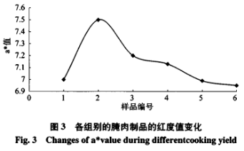 從圖3能夠看得出,2號(hào)a*值自始至終小于2~5號(hào),而2~六號(hào)的a*值轉(zhuǎn)變 呈慢慢下降趨勢(shì)。融合感觀點(diǎn)評(píng),2~六號(hào)的小組之間a*值轉(zhuǎn)變 差別并不大,全部組其他餃子餡在腌漬期內(nèi),均為優(yōu)良的暗紅色。加溫處置后的仿真模擬腌肉食品1~六號(hào)紅度值貼近,與此同時(shí)感觀點(diǎn)評(píng)也得到基本上色調(diào)接近的結(jié)果。銷售市場(chǎng)上所設(shè)計(jì)方案的肉食品色調(diào)多用以加上著色劑來校準(zhǔn),并沒有對(duì)谷氨酰胺谷丙轉(zhuǎn)氨酶及豬肉皮膠原對(duì)肉類食品的自身的本底色調(diào)危害開展科學(xué)研究。