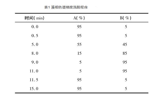 離子交換柱:WatersAcquityUPLCHSST3(2.1mm×10cm,1.8μm);柱溫:30℃;流動速度:0.3ml/min;進樣量:10μl;流動性相構成:A:5mmol/L乙酸銨溶液,B:工業(yè)甲醇-乙腈(1∶1,V/V),梯度方向過柱,見表1。