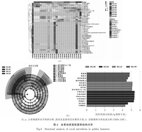 歸類構成剖析(LEfSe剖析)如圖所示4b所顯示。高、小劑量HRS組飼養(yǎng)4周與空缺對照實驗、實體模型組飼養(yǎng)2周時盲腸內容物中好幾個歸類群存有明顯差別。與其他組對比,在其中小劑量HRS干涉4周時擬桿菌的進化速率高,高使用量HRS干涉組有益菌關鍵為瘤胃革蘭陰性桿菌科(Ruminococcaceae)和梭菌屬(Clostridia)。
