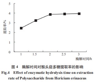 由圖4得知伴隨著酶解時間的擴大,猴頭菇含糖量得率呈擴大發(fā)展趨勢,當酶解2h之后,很有可能因為猴頭菇機構(gòu)內(nèi)外含糖量濃度值超過均衡,或是總混的含糖量發(fā)生了一部分溶解,造成 含糖量得率展現(xiàn)遲緩擴大發(fā)展趨勢。