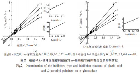 植酸和L-抗壞血酸豆蔻酸酯對(duì)α-葡萄糖苷酶抑止種類如圖2所顯示。圖2a所顯示,植酸的Lineweaver-Burk圖中平行線1~4交叉于第Ⅱ象限,伴隨著植酸濃度值上升,米氏常數(shù)(Km)增大,較大 化學(xué)反應(yīng)速率(Vmax)減少,說(shuō)明效用物植酸對(duì)α-葡萄糖苷酶是復(fù)合型抑止,具備競(jìng)爭(zhēng)抑止和非競(jìng)爭(zhēng)抑止2種方式。植酸既能與分散的酶融合,也可以與酶-底物一氧化氮合酶融合。根據(jù)制作Dixon圖計(jì)算抑止參量KI和KIS各自為KI=0.117mol/L和KIS=0.163mol/L。由KI值低于KIS值,說(shuō)明化學(xué)物質(zhì)與α-葡萄糖苷酶融合以外,關(guān)鍵產(chǎn)生ESI(效用物-酶-底物)一氧化氮合酶。