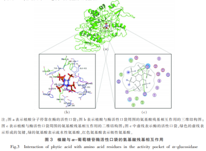 植酸與α-葡萄糖苷酶活力袋子的氨基酸殘基相互影響如圖所示3所顯示。如圖所示3a所顯示,植酸進(jìn)到葡萄糖苷酶的活力袋子中,活力袋子周邊關(guān)鍵的碳水化合物Phe303,Phe159,Val216,Leu219,Phe178是疏水性碳水化合物,與活力袋子的產(chǎn)生相關(guān),這與植酸進(jìn)到活力袋子也是有一定的危害。如圖所示3b,3c所顯示,植酸分子結(jié)構(gòu)含有6個(gè)磷酸根離子,所需的陽(yáng)離子有益于與活力袋子周邊帶正電的氨基酸殘基相互影響。配位分子結(jié)構(gòu)植酸與α-葡萄糖苷酶活力袋子氨基酸殘基Arg315,Arg442,Gln279產(chǎn)生共價(jià)鍵。共價(jià)鍵是植酸與α-葡萄糖苷酶融合的主導(dǎo)作用。除此之外,植酸與氨基酸殘基Glu411,Gln353,Asp307,Glu277,Asp352,His351,Thr306,His280,Asn350,Tyr72,Tyr158產(chǎn)生范德華力,產(chǎn)生的非共價(jià)鍵相互作用力(共價(jià)鍵和范德華力),在平穩(wěn)植酸與α-葡萄糖苷酶一氧化氮合酶中起關(guān)鍵功效。