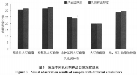 由圖3能夠看得出,加上酶改性材料大豆卵磷脂試品、甲基化大豆卵磷脂試品和單,雙凡士林油酸酯試品的估測觀查得分相對性較高,且區(qū)別不顯著,根據(jù)置放1周商品的估測觀查結(jié)果沒法挑選出最合適的破乳劑。