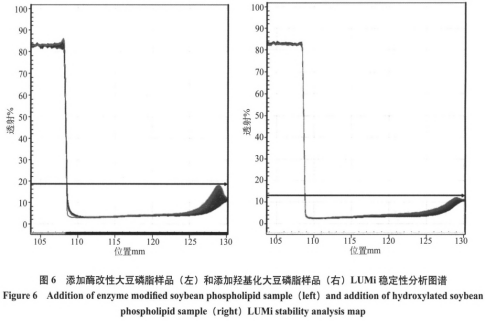 圖6中下左圖相匹配加上酶改性材料大豆卵磷脂試品,深入分析其LUMi圖普,加上酶改性材料大豆卵磷脂試品最右邊(即試品管底端)有一塊顯著的黑影,說明在離心式歷程中由于離心式水平的增加,試品管底端地區(qū)透光度慢慢擴大,造成這些情況有可能的因素是離心式促使試品管底端小顆粒集聚,而且人體脂肪上調(diào),這表明管理體系內(nèi)部顆粒的分散化可靠性不大好;下圖為加上甲基化大豆卵磷脂試品,其總體的透光度轉(zhuǎn)變 較小,管理體系內(nèi)部顆粒物在離心作用下分散化可靠性不錯。因而,加上甲基化大豆卵磷脂試品的穩(wěn)定相對而言不錯。