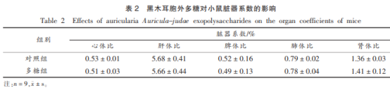 與實(shí)驗(yàn)組對(duì)比,灌胃木耳胞外含糖量后小白鼠休重?zé)o顯著轉(zhuǎn)變 (圖2)。內(nèi)臟器官指數(shù)是體現(xiàn)動(dòng)物器官生長(zhǎng)發(fā)育的主要指標(biāo)值,可直接體現(xiàn)受試物對(duì)小動(dòng)物存有的危害功效。本分析根據(jù)稱(chēng)重小白鼠各內(nèi)臟器官機(jī)構(gòu)品質(zhì),測(cè)算其內(nèi)臟器官指數(shù)。木耳胞外含糖量對(duì)小白鼠內(nèi)臟器官指數(shù)的危害見(jiàn)表2,數(shù)據(jù)分析表明,試品組和對(duì)比結(jié)果無(wú)顯著性差異(P>0.05)。以上實(shí)驗(yàn)說(shuō)明,灌胃木耳胞外含糖量不容易造成小白鼠內(nèi)臟器官產(chǎn)生生理性出現(xiàn)異常。