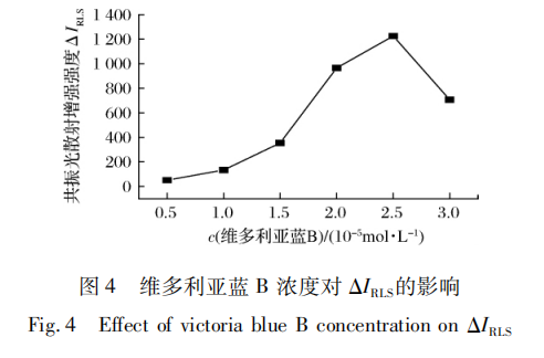 2.2.3維秘藍B濃度值取甜蜜素規(guī)范實際操作液1.00mL?pH9.27Tris-HCl水溶液1.50mL,按1.4節(jié)方式調(diào)查0.50~3.00mL范疇的維秘藍B實際操作液對甜蜜素-維秘藍B管理體系ΔIRLS的危害,結(jié)果見圖4?從ΔIRLS-c維秘藍B曲線圖得知,維秘藍B的最佳濃度值為2.50×10-5mol/L(即維秘藍B實際操作液的最可用量為2.50mL),當維秘藍B濃度值高于或低于該值時,管理體系ΔIRLS均有不一樣程度上降低,當<2.50×10-5mol/L時,維秘藍B使用量不足,與甜蜜素反映不徹底;當>2.50×10-5mol/L時,又因維秘藍B過多使本身集聚功效提高進而干擾與甜蜜素間的反映,敏感度隨著降低?故試驗挑選管理體系敏感度較大 時的維秘藍B溶液的濃度即2.50×10-5mol/L?