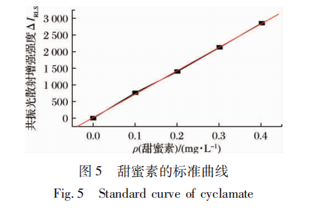 按1.4節(jié)的實驗方法,配置0.00?0.50?1.00?1.50?2.00mL甜蜜素規(guī)范實際操作液的規(guī)范系列產(chǎn)品水溶液,掃描儀RLS光譜儀,作甜蜜素的標曲,見圖5?該辦法的一元線形線性回歸方程為ΔIRLS=14.20 7038ρ,相關(guān)系數(shù)r=0.9997,線形范疇為0.004~0.4mg/L,方法檢出限為0.0035mg/L,吐司面包和曲奇餅干的定量限為2.69mg/100g,飲品的定量限為29.2mg/L?
