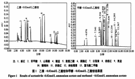 本實(shí)驗(yàn)較為乙腈-0.02mol/L乙酸銨和工業(yè)甲醇-0.02mol/L乙酸銨按表1梯度方向開(kāi)展過(guò)柱時(shí),發(fā)覺(jué)新紅與苯甲醛,靛青與脫氫乙酸分離度達(dá)不上1.5的規(guī)定,緣故將會(huì)有幾個(gè)方面:最先,乙腈過(guò)柱工作能力比工業(yè)甲醇強(qiáng),在UV光波長(zhǎng)較短的色譜上具備較高靈敏,且色譜儀級(jí)的乙腈是吸收力較為小的有機(jī)溶液,故乙腈過(guò)強(qiáng)的過(guò)柱工作能力及其乙腈獨(dú)有的特性都是會(huì)導(dǎo)致出峰時(shí)間靠前的目的物和殘?jiān)寤蚴青徑姆咫x不開(kāi);次之,苯甲醛、山梨酸、脫氫乙酸、納他霉素旋光性相較檸檬黃、日落黃、誘惑紅旋光性稍強(qiáng),選用乙腈階梯性梯度方向過(guò)柱,出峰速度更快,控制不了栽培基質(zhì)基準(zhǔn)線影響;其次,點(diǎn)心中的栽培基質(zhì)大部分為碳酸鹽、蛋白、糖原等,乙腈過(guò)柱不可以合理規(guī)避這種栽培基質(zhì)對(duì)目的物的影響,實(shí)驗(yàn)中也根據(jù)調(diào)節(jié)梯度方向過(guò)柱的占比,可是不管怎樣調(diào)節(jié)依然不能將13種總體目標(biāo)物徹底分離出來(lái),殊不知選用工業(yè)甲醇過(guò)柱可以有效的防止乙腈存有的這種難題,結(jié)果見(jiàn)圖1。此次實(shí)驗(yàn)還挑選了工業(yè)甲醇一0.02mol/L乙酸銨與工業(yè)甲醇-0.02mol/L磷酸二氫銨水溶液開(kāi)展梯度方向過(guò)柱,13種食用添加劑均為旋光性化學(xué)物質(zhì),與水均能相溶,選用0.02mol/L磷酸二氫銨對(duì)添加劑的分開(kāi)沒(méi)有危害,可是這一水體的流動(dòng)性相對(duì)性色譜儀分離出來(lái)危害很大,絕大多數(shù)色譜儀均不可以合理過(guò)柱,結(jié)果見(jiàn)圖2,綜合性考慮到,本實(shí)驗(yàn)最后挑選工業(yè)甲醇一0.02mol/L乙酸銨按表1程序流程開(kāi)展分離出來(lái)。