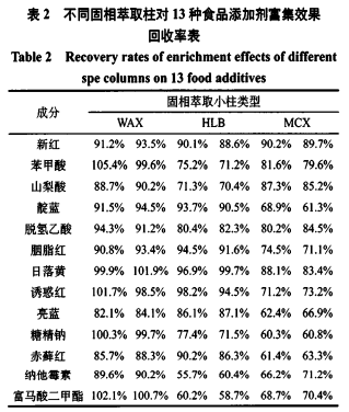 結(jié)果見(jiàn)表2,從結(jié)論還可以看得出,WatersOasisWAX固相萃取小柱利用率最大,對(duì)這次實(shí)驗(yàn)的13種食用添加劑聚集比較好,WatersOasisHLB固相萃取小柱和WatersOasisMCX固相萃取小柱利用率其次,緣故可能是,WatersOasisWAX固相萃取小柱特性為復(fù)合型弱陽(yáng)離子互換正相反吸收劑,具備弱陽(yáng)離子互換和非極性親水性雙向功效的混和吸收劑,對(duì)強(qiáng)酸堿性化學(xué)物質(zhì)具備高的目的性和敏感度,含弱堿性的胺基作用官能團(tuán),適用從偏堿或中性化化學(xué)物質(zhì)中分離純化酸性物質(zhì),可用以強(qiáng)酸堿性化學(xué)物質(zhì)的解決,此次實(shí)驗(yàn)的13種添加物均為水溶化學(xué)物質(zhì),選用WAX開(kāi)展聚集,2%苯甲酸清理可以將試樣中正離子狀況的雜物清理除去,再用5%氨解工業(yè)甲醇將聚集在固相萃取小柱分子結(jié)構(gòu)情況的食品添加劑開(kāi)展離子化過(guò)柱出來(lái);WatersOasisHLB內(nèi)的吸收劑是根據(jù)一個(gè)“獨(dú)特的旋光性捕捉官能團(tuán)”來(lái)提升對(duì)旋光性有機(jī)物的保存給予不錯(cuò)的水浸潤(rùn)性,用以酸堿性,中性化和偏堿化學(xué)物質(zhì)的通用性吸收劑,這類特性用以剖析人造黑色素很好的,可是這一小柱對(duì)添加劑中的納他霉素和富馬酸二甲酯的保存聚集實(shí)際效果較弱,緣故可能是HLB內(nèi)填充料是親脂化學(xué)物質(zhì),而納他霉素和富馬酸-ep酯是吸水性的,WatersOasisMCX固相萃取小柱是復(fù)合型正離子互換正相反吸收劑,對(duì)偏堿化學(xué)物質(zhì)具備高的目的性和敏感度,MCX小柱對(duì)一部分黑色素和添加劑的聚集實(shí)際效果也非常差,不可以與此同時(shí)對(duì)13種成份開(kāi)展剖析,故此次實(shí)驗(yàn)挑選WatersOasisWAX固相萃取小柱開(kāi)展。