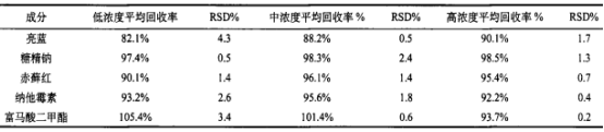 各自稱量9份呈陰性試品,各2.5g,按以上色譜儀標(biāo)準(zhǔn)及其提升好的前解決方式,以低、中、高三個(gè)濃度值水準(zhǔn)開展加上規(guī)范混和貯備液為0.3mL、1.0mL、2.5mL,加上后濃度值各自約為2.4μg/mL、8.0μg/mL、20μg/mL,按以上色譜儀標(biāo)準(zhǔn)及其提升好的前解決方式,稱量破碎勻稱的點(diǎn)心試品2.5g置50mL離心管架中,加25mL水,各加5mL106g/L亞鐵氰化鉀水溶液和5mL219g/L乙酸鋅水溶液,渦流10min10min后取下,量取上清液5mL過QasisWAX固相萃取小柱(事先經(jīng)3mL工業(yè)甲醇及其3mL水活性),棄去排出液,先后用6mL2%苯甲酸和6mL純水系統(tǒng)清理,再用5%氨解工業(yè)甲醇過柱并搜集于15mL離心管架中,在40℃水浴中氮吹至近干后取下置放室內(nèi)溫度,用5mL水復(fù)溶沉渣,過0.45μmGHP微孔濾膜后,被測(cè)。結(jié)果見表4,結(jié)果顯示,點(diǎn)心中13種食用添加劑均值利用率為82.1%~105.4%,RSD為低于5%(n=9),表明此次實(shí)驗(yàn)方式利用率與精度優(yōu)良。