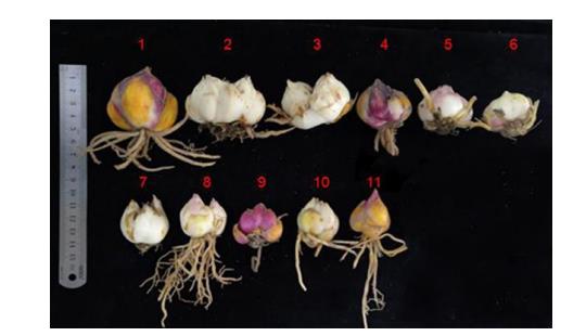 供試原材料自2015年栽種于山西省農(nóng)業(yè)大學園藝花卉站百合花種源圃,2019年10月百合花地面上部徹底干枯后,采摘11份原材料(各自為‘LadyAlice’、‘Matrix’、‘EasyWaltz’、‘MisterRight’、‘PearlMelanie’、‘GoldenStone’、蘭州百合、‘BrightDiamond’、‘Regale’、‘Easylife’、‘MisterSandman’)的完善根莖各6個(周徑>10cm,圖1)。所采的根莖清洗土壤、除掉凋謝和病蟲害一部分后,剝?nèi)⊥旰脽o損魚鱗,將同一種類魚鱗混和后,一部分植苗于帶栽培基質(zhì)的框中,保存鮮樣開展一部分營養(yǎng)成分和作用成份的含水量測量;另一部分放置50℃的烘干箱中烘5~7天,烘干處理后破碎機破碎后過60目篩,儲存于空氣干燥器內(nèi)預留,用以營養(yǎng)成分和作用質(zhì)量測量。