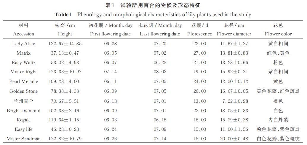 百合花的觀賞價值狀如圖2和表1,11種香水百合色、花徑、株高和物候等領(lǐng)域具備多元性?;ò臧巳榘咨?lsquo;BrightDiamond’)、淡黃色(‘PearlMelanie’)、橘色(蘭州百合)、鮮紅色(‘Matrix’)和藍紫色(‘MisterSandman’)等各種色調(diào),在其中有一些花朵為單色如‘BrightDiamond’、‘PearlMelanie’、‘Matrix’,有一些花朵為復色如‘MisterRight’、‘MisterSandman’、‘LadyAlice’,有一些花朵含有不一樣顏色的色斑如‘Easylife’、‘GoldenStone’、蘭州百合。