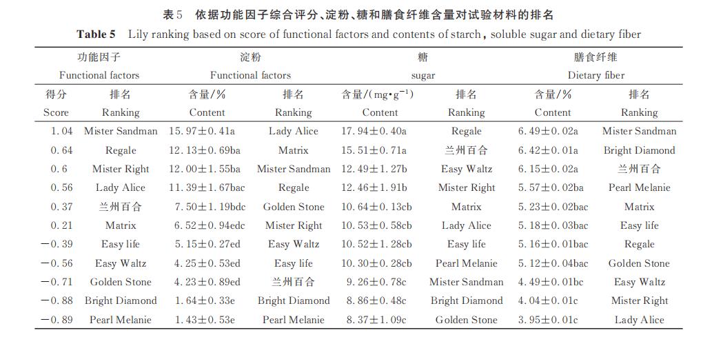 由表5得知,根據(jù)作用因素對所檢測原材料開展排行,排名前4的為藍紫色根莖種類:MisterSandman、Regale、MisterRight和LadyAlice;根據(jù)木薯淀粉成分開展排行,排名前4且差別不明顯的有4種:LadyAlice、Matrix、MisterSandman和Regale;根據(jù)糖成分開展排行,排行在前且差別不明顯的有兩個:Regale和蘭州百合。膳食纖維素成分做到2%之上的食材歸屬于膳食纖維素食材,由此可見所檢驗百合花均為膳食纖維素食材,根據(jù)膳食纖維素成分開展排行,排名前3且差別不明顯的是MisterSandman、BrightDiamond和蘭州百合。