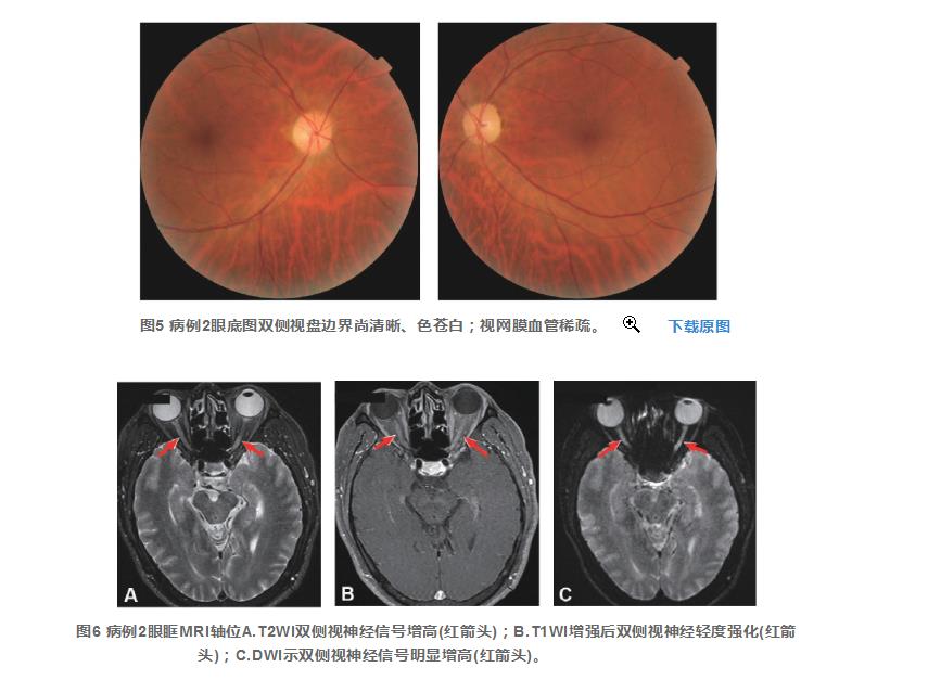 病案2:男士,四十五歲。眼睛急劇眼睛視力下降,1d后雙目失明。伴頭疼、輕微惡心想吐。病前食用散裝白酒約100g。體檢最好視力矯正:眼睛無光澤。雙側(cè)瞳孔大,約5mm,對光反射消退。眼眸雙側(cè)視圖盤界限尚清楚,略血腫、色紅;黃點(diǎn)及眼底黃斑末見顯著出現(xiàn)異常(圖5)。血常規(guī)檢查、生物化學(xué)及血沉、風(fēng)濕免疫組套均呈陰性;AQP4抗原呈陰性。腦顱及眼圈MRI:腦本質(zhì)內(nèi)未見異常;雙側(cè)眼睛神經(jīng)末見顯著加強(qiáng),DWI彌漫編碼序列由此可見數(shù)據(jù)信號提高(圖6)。依照危重癥球后視神經(jīng)炎給與甲潑尼龍1g靜脈血管沖擊性醫(yī)治5d,眼睛視力仍無光澤。隨診:親屬將剩下純糧酒復(fù)檢,數(shù)據(jù)顯示工業(yè)甲醇濃度值超標(biāo)準(zhǔn)100倍。隨診兩個月后病人眼睛視力仍為無光澤。眼眸雙側(cè)視圖盤慘白委縮。