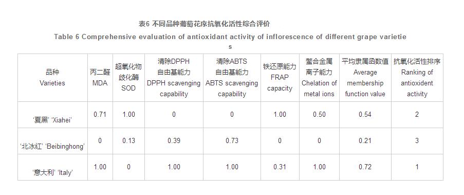 從表7能夠看得出,根據(jù)以上指標值,對紅提花序的整體質量開展點評,結果顯示,‘西班牙’花序的整體質量最好是,‘夏黑’僅其次,‘北冰紅’較弱。根據(jù)此結果,‘西班牙’花序和‘夏黑’花序更合適生鮮或開展精工細作生產加工,開發(fā)設計出具備各種功能性的保健產品、食品類或護膚品。