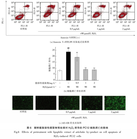 為了更好地進(jìn)一步研究脂溶性提取液能不能合理地抑止細(xì)胞壞死,運(yùn)用AnnexinV-FITC/PI開展上色,經(jīng)流式細(xì)胞術(shù)檢驗(yàn)細(xì)胞壞死率(圖6a)。如圖所示6b所顯示,與空白試驗(yàn)組(8.14%)對(duì)比,H202解決明顯提高了細(xì)胞壞死率(23.66%),經(jīng)朝鮮薊脂溶性提取液預(yù)備處理后,PCI2體細(xì)胞的細(xì)胞凋亡獲得明顯抑止。在其中,歷經(jīng)2mg/L脂溶性提取液預(yù)維護(hù)后,細(xì)胞壞死率減少至8.75%。