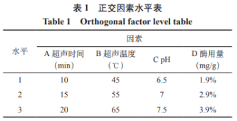在單要素實(shí)驗(yàn)的根基上,對(duì)危害胰蛋白酶的水解度和復(fù)原力的首要要素超聲波時(shí)間、超聲波溫度、pH、酶使用量等開展L9(34)正交實(shí)驗(yàn),以明確胰蛋白酶酶解的最合適的技術(shù)標(biāo)準(zhǔn)。正交試驗(yàn)要素水準(zhǔn)見表1。