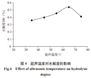 由圖4得知,起先伴隨著超聲波溫度的提升,紅花籽粕的水解度擴(kuò)大,在超聲波溫度是65℃時(shí),水解度較大,隨后逐漸發(fā)生下降趨勢(shì),表明在65℃以內(nèi)時(shí)可能是因?yàn)闊徂D(zhuǎn)性導(dǎo)致的水解度較大;由圖5得知,起先伴隨著超聲波溫度的提升,紅花籽粕的復(fù)原力擴(kuò)大,在超聲波溫度是55℃時(shí),復(fù)原力較大,隨后逐漸發(fā)生下降趨勢(shì),可是降低不顯著。綜合性考慮到水解度、復(fù)原力等要素,覺(jué)得最好超聲波溫度為65℃。