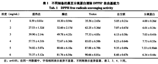1、不一樣制取的大黑豆分離蛋白消除DPPH氧自由基工作能力