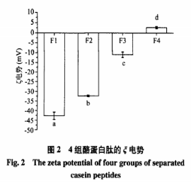 分離出來獲得的4組opo結(jié)構(gòu)脂成分的外表正電荷特性根據(jù)ζ電勢差開展明確。由圖2得知,從F1到F4成分的ζ電勢差慢慢提升,各自為-43mV,-32mV,-11mV和3mV,且彼此之間具有著顯著性差異(P<0.05)。這一測量結(jié)果與以上opo結(jié)構(gòu)脂肽成分的分離純化相一致,F(xiàn)1和F2成分含有較多負電,ζ電勢差較低;F3和F4成分最終從SPsephadexC-25正離子互換填充料上過柱出來,所需負電相對性較少,因而ζ電勢差較高。不一樣的ζ電勢差說明opo結(jié)構(gòu)脂肽成分在溶液中可靠性不一樣,與此同時也會危害肽與金屬離子中間的相互影響及其產(chǎn)生金屬材料螯合物的可靠性。比如,有專家研究發(fā)現(xiàn)因為帶有較多帶負電的磷酸基團,opo結(jié)構(gòu)脂磷酸肽在pH轉(zhuǎn)變的標準下依然可以與鐵產(chǎn)生比較穩(wěn)定的一氧化氮合酶。因而,因為ζ電勢差的不一樣,本實驗操作中剝離獲得的opo結(jié)構(gòu)脂肽成分鰲合鋅離子的功能及其產(chǎn)生肽鋅螯合物的可靠性會存有很大的差別。