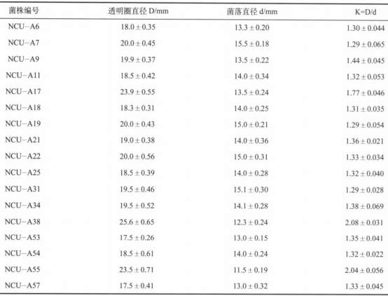 點種取決于調查優(yōu)質菌種是不是能在集中的培育中仍能保持較高的中性蛋白酶魅力,而且規(guī)定菌種的發(fā)育速度快,對自然環(huán)境適應能力強。菌種正基因突變主要表現(xiàn)為菌體漲勢好而且K值比對比值大。由表1得知,18株初篩菌種的K值均超過初始菌種,其產(chǎn)中性蛋白酶工作能力很有可能好于初始菌種,在其中菌種NCU—A38、NCU—A55、NCU—A17菌體漲勢不錯,且全透明圈直徑較大,各自為25.6、23.5、23.5mm,而他們的K值則各自實現(xiàn)了2.08、2.04、1.77。袁艷玲研究表明,根據(jù)K值挑選正基因突變株高效率,但菌種的產(chǎn)中性蛋白酶工作能力與K值并并不是呈規(guī)律性的線性相關。因此必須進一步的復篩來明確最后增產(chǎn)中性蛋白酶活的基因突變株,試驗選用淺盤酒曲制作測量中性蛋白酶活給予認證。