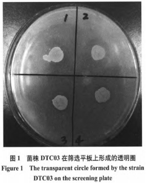 將聚集塑造的泥樣梯度方向稀釋液后,施膠于加上柚皮苷的挑選培養(yǎng)液,30℃顛倒塑造,每日觀查冒出的菌體形狀及全透明圈發(fā)生狀況。挑菌初篩發(fā)生全透明圈的菌體,分離純化后挑菌單菌體點樣至挑選平板電腦。挑選平板電腦分四塊地區(qū)點樣后放進(jìn)30℃恒溫箱顛倒塑造,7d后得到1株有顯著全透明圈菌種,如圖所示1。將該菌種取名為DTC03。