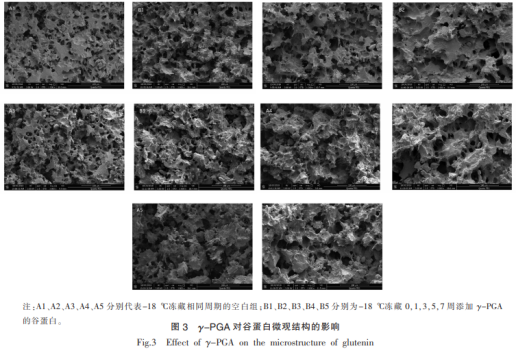 3為不一樣凍藏周期時間谷蛋白外部經(jīng)濟框架圖,凍藏前期谷蛋白根據(jù)鏈內(nèi)和鏈外二硫鍵產(chǎn)生了高寬比數(shù)字化構(gòu)造,使其具備持續(xù)的結(jié)構(gòu)特征及較小的孔眼。隨凍藏時間提升,發(fā)覺其外部經(jīng)濟構(gòu)造受到損壞。凍藏5星期過后,谷蛋白互聯(lián)網(wǎng)趨向破裂,發(fā)生顯著結(jié)團狀況,關(guān)鍵因素可能是凍藏期內(nèi)冷藏收攏功效促使鄰近的小冰霜匯聚產(chǎn)生大冰霜引起的構(gòu)造破裂。與此對比,γ-PGA組到凍藏前期谷蛋白互聯(lián)網(wǎng)孔眼增大,但依然展現(xiàn)不錯的網(wǎng)絡(luò)架構(gòu),這是由于γ-PGA具備優(yōu)良的吸水能力而與谷蛋白中間產(chǎn)生了競爭吸濕,造成其孔眼直徑增大,但與空缺組不一樣,隨凍藏時間增加γ-PGA組的谷蛋白互聯(lián)網(wǎng)的持續(xù)性比空缺更穩(wěn),且破裂得較少,γ-PGA優(yōu)良的增稠特性造成水份停留實際效果,促使水份流通性減少可能是這其中的首要緣故。較持續(xù)的網(wǎng)絡(luò)架構(gòu)也使谷蛋白的耐熱性提升,與以上實驗結(jié)果相符合。與此同時說明γ-PGA合理減輕了凍藏期內(nèi)谷蛋白的劣變,其實際效果將會在減緩面條蛋白質(zhì)劣變中進行了奉獻。