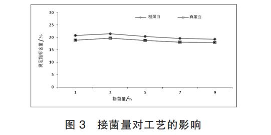 伴隨著接菌量的慢慢提升, 發(fā)醇產(chǎn)品中粗蛋白 質(zhì)和真蛋白質(zhì)指標(biāo)值成分展現(xiàn)先提高后減少的發(fā)展趨勢,說明適當(dāng)?shù)奶嵘泳靠梢蕴嵘l(fā)醇產(chǎn)品中的真 蛋白質(zhì)成分, 但多菌苗相互間的營養(yǎng)成分市場競爭造成 黑曲霉糖化功效形成的可溶性糖成分驟降, 危害微生物菌種成長發(fā)育,融合經(jīng)濟(jì)收益挑選接菌量為 1%。