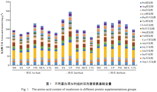 蛋白的營養(yǎng)成分在于碳水化合物的百分比及必須氨基酸的類別和成分。依據(jù)1973年FAO/WHO要求的理想化蛋白中必須氨基酸的實(shí)體模型,本科學(xué)研究中各潮次雙孢蘑菇子囊孢子的優(yōu)點(diǎn)碳水化合物前3位均為Glu、Va和Asp,在其中Glu和Asp是最重要的乳酸乙酯碳水化合物,決策了菌類美味可口與爽口水平,而Val則是人體內(nèi)必要的8種碳水化合物之一。楊紅澎等報(bào)導(dǎo),雙孢蘑菇子囊孢子中,碳水化合物總成分為31.19%,在其中Glu、Val和Asp成分各自居第1、2和5位,成分各自為8.40%、3.14%和2.33%。林忠寧等報(bào)導(dǎo),雙孢蘑菇子囊孢子蛋白質(zhì)含量為42.10%,在其中占比最多的7種碳水化合物先后為Glu、Asp、Lue、Ala、Lys、Arg和Val。由此可見,Glu、Val和Asp為雙孢蘑菇子囊孢子中的優(yōu)點(diǎn)碳水化合物種類,而不一樣實(shí)驗(yàn)中成分的差別,很有可能與培養(yǎng)料成份相關(guān)。FM組Glu成分和總?cè)樗嵋阴ヌ妓衔锍煞郑―AA)在第一、三潮菇時(shí)最大,與其說碳水化合物成分充足且當(dāng)期生產(chǎn)量較低相關(guān)。ES和CP組到第二和第三潮菇時(shí),TAA、EAA、DAA較第一潮明顯上升,這也是因?yàn)樗麄兊牡诙偷谌惫缴a(chǎn)量小于第一潮,使子囊孢子質(zhì)量進(jìn)而提高。