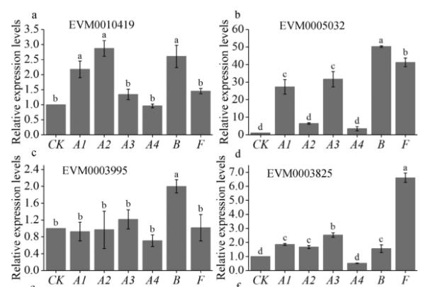 圖2注射6d后排風(fēng)管菌預(yù)測(cè)分析具備信號(hào)肽構(gòu)造的植物細(xì)胞裂化酶遺傳基因相對(duì)性表述量分析將排風(fēng)管菌獨(dú)立塑造做為對(duì)照實(shí)驗(yàn);A1為鏈格孢;A2為鏈格孢iPhone?;?;A3為茄鏈格孢;A4為細(xì)極鏈格孢;B灰紅提孢;F為尖孢鐮刀菌.依據(jù)多重比較結(jié)果,不一樣英文字母表明差別明顯(P≤0.05)。