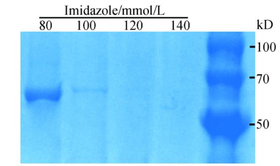 應(yīng)用鎳柱對(duì)重組蛋白BaCHIB開(kāi)展了分離純化,在咪唑濃度值為80mmol/L時(shí)目地蛋白質(zhì)能被高效率過(guò)柱,并在之后的SDS-PAGE中表明為單一雜帶(圖3)。尺寸在50~70kD中間,與預(yù)測(cè)分析分子結(jié)構(gòu)大小63.6kD相仿。對(duì)凈化后的重組蛋白開(kāi)展活力測(cè)量,在37℃下幾丁質(zhì)酶活力約為17.7U/mg。