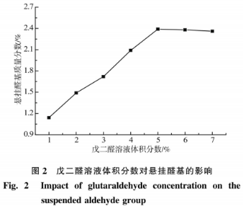 殼聚糖脂質(zhì)體媒介懸架醛基的總數(shù)與其說固定化工作能力的高低相關(guān)。不一樣摩爾分?jǐn)?shù)的戊二醛對殼聚糖脂質(zhì)體媒介上懸架醛基質(zhì)量濃度的危害見圖2。