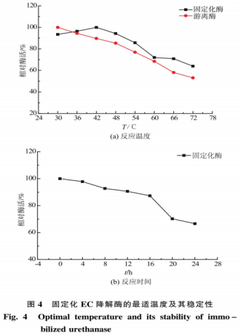 發(fā)生適宜溫度遷移可能是南于EC溶解酶的空間構(gòu)造遭受同定化媒介的干擾而略微更改,尤其是在42℃之后,固定化酶EC溶解酶的空間布局比較平穩(wěn),催化反應(yīng)底物工作能力比分散酶略高。也是有別的科學(xué)研究結(jié)果顯示固定化酶脲酶與分散酶的適宜催化反應(yīng)溫度有一定的差別,但二者的催化劑實(shí)際效果并沒有明顯差別。