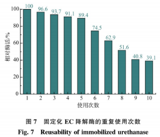 如圖所示7所顯示,在仿真模擬酒樣對(duì)固定化酶EC溶解酶開(kāi)展可重復(fù)性試驗(yàn),數(shù)據(jù)顯示,每一次運(yùn)用后酶活均有降低。當(dāng)多次重復(fù)使用8次之后,固定化酶EC溶解酶酶魅力保存在50%之上,因而在8次前應(yīng)用成效不錯(cuò)。